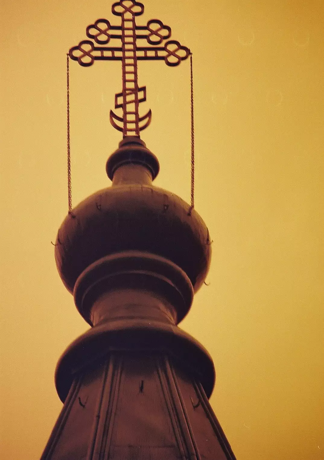 The three crossarm of different lengths and shapes of the orthodox cross symbolize Christ’s crucifixion: The short upper arm of the cross represents the titulus board (i.e. where the inscription INRI was seen). The middle arm represent the place where the arms of Christ were attached. And the slanted arm is the suppedaneum (the board under the feet at the crucifixion)