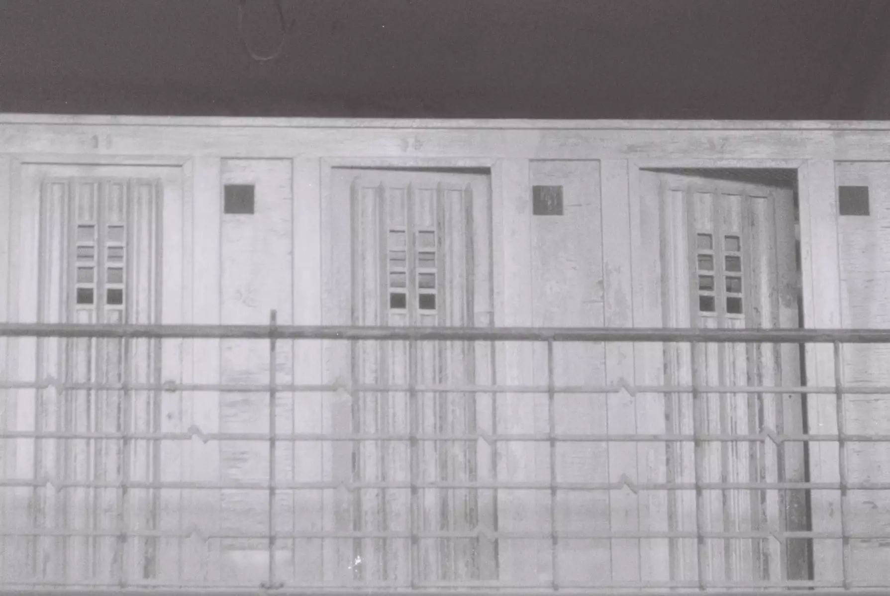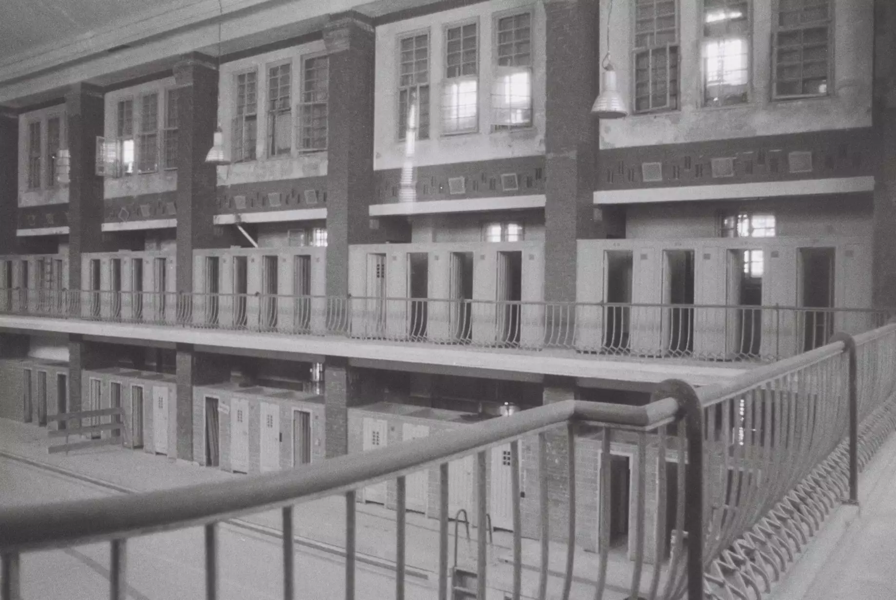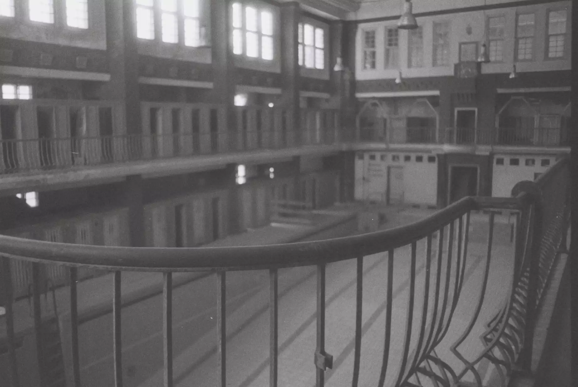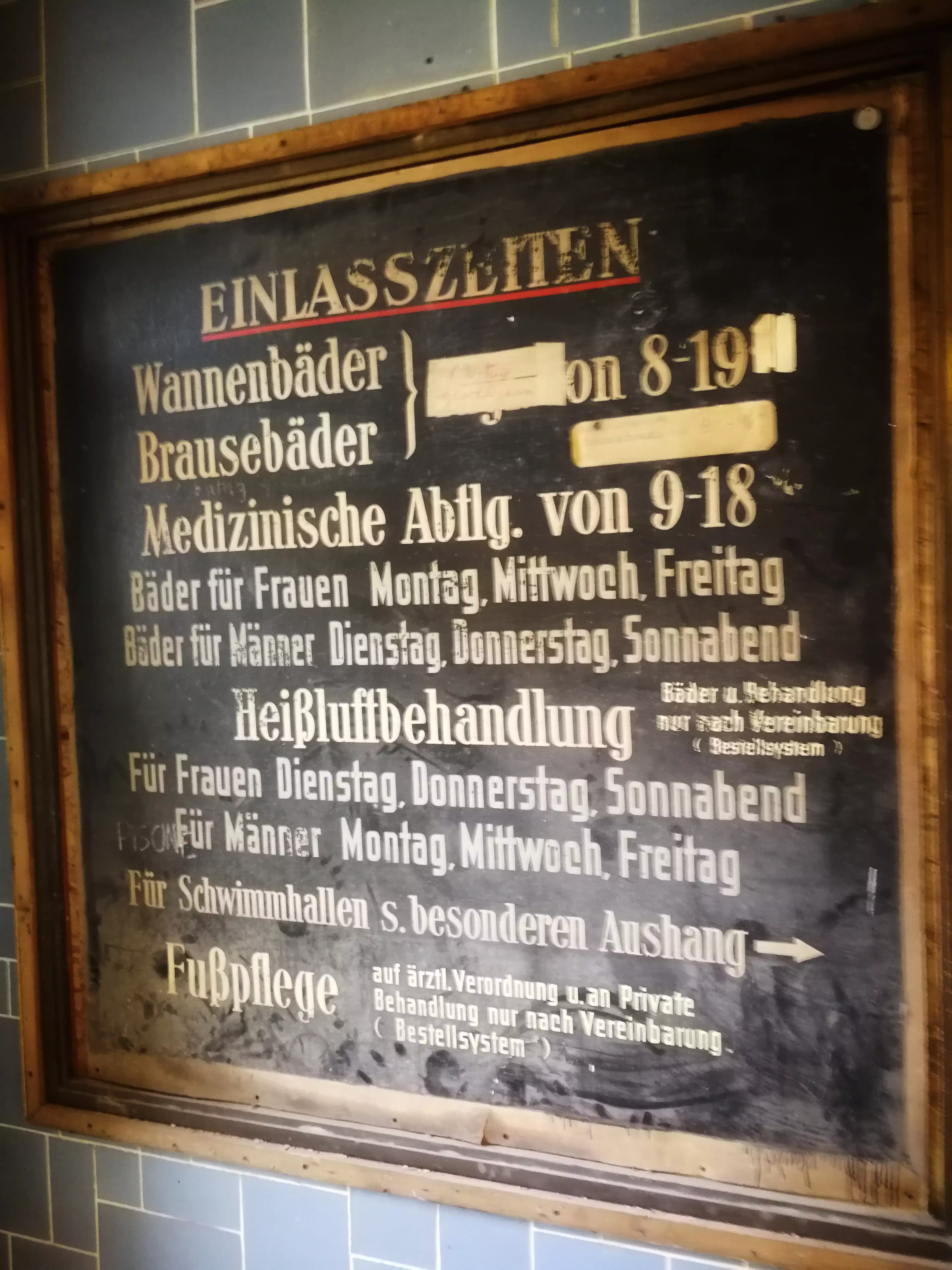 The builders repaired the worst damage that occurred after years of vacancy, but also tried to preserve as much of the original condition as possible in accordance with the monument protection requirements. Monument protection (“Denkmalschutz”) in Germany requires that renovations respect the historical character and original materials of listed buildings. It has a strange vibe to see the old battered walls, railings, inscriptions, the old GDR snack machines with currency notes where the currency long time vanished. I would have loved to stroll around alone and check the rooms. Some people somehow did though. There was a small platform on the first floor, so that people could look through a small window into the former swimming pools. The doors where closed, obviously, but too my surpise, when i was looking through my viewfinder to arrange a shot, two persons appeared before me. It took me a moment to realize that there were sneaking around inside the swimming pool room. I don’t know… on one hand, I can totally understand the curiosity, on the other hand it feels disrespectful to the place.